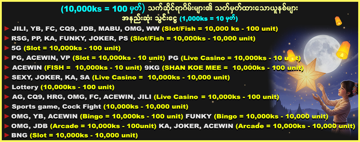 2. Slot ဂိမ္းအားလုံးတြက္ခ်က္ေပးပါသည္။(YGG ၊ ACE WIN မပါဝင္ပါ)အႏိုင္ရရွိေသာဆုမ်ားကို ႀကိမ္ေရတစ္ဆကစားၿပီးမွသာလွ်င္ေငြထုတ္ႏိုင္မည္။